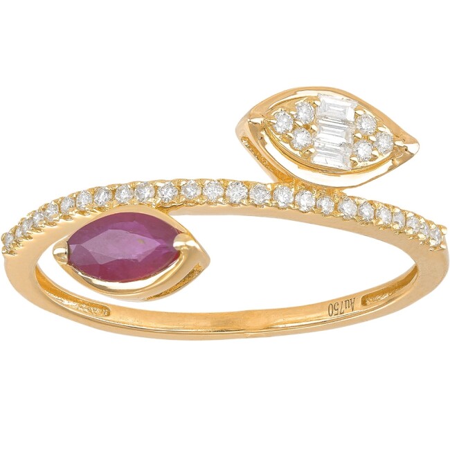 Bague Toi et Moi, diamants 0,16ct et rubis navette 0,34ct, Or jaune 18k